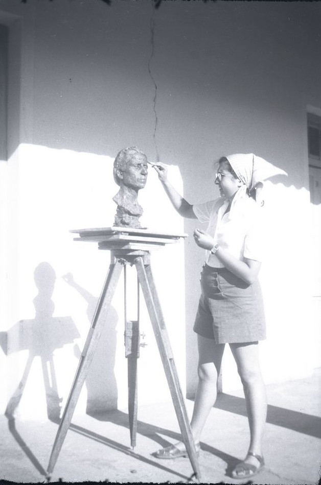 Φιλμ, αρνητικό, α/μ, 9×6,5 εκ., τοποθετημένο σε θήκη αρνητικών από ριζόχαρτο μαζί με τρία ακόμη αρνητικά. Η Ιωάννα Βεροπούλου-Σπητέρη σε αυλή του εξοχικού σπιτιού στη Νέα Μάκρη ενώ εργάζεται έργο «Αργυρώ». Πάνω στη θήκη, επιγραφή, στα ελληνικά.
