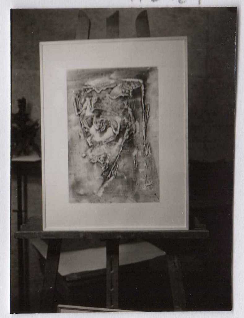 Φωτογραφία, α/μ, φωτογραφικό χαρτί, 6×4 εκ., έργου (σχέδιο) της Ιωάννας Βεροπούλου- Σπητέρη. Κολλημένη σε φύλλο Α4 μαζί με άλλες δεκαεπτά φωτογραφίες.