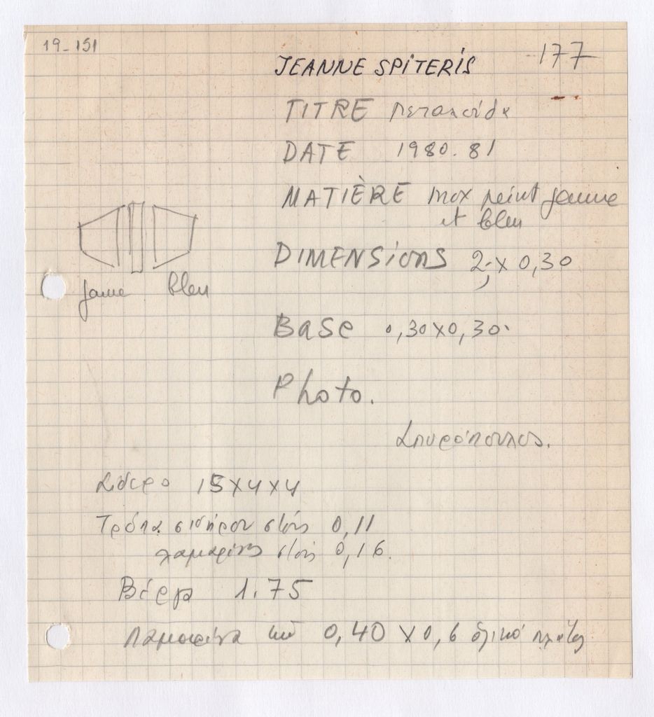 Απόκομμα, χαρτί, μία όψη, 16×14 εκ., επικολλημένο σε φύλλο χαρτιού Α4. Χειρόγραφη φόρμα καταγραφής στοιχείων του έργου στα γαλλικά, όπου συμπληρώνονται χειρόγραφα τα στοιχεία του έργου. Στο χαρτί, σχέδιο του έργου, με μολύβι.