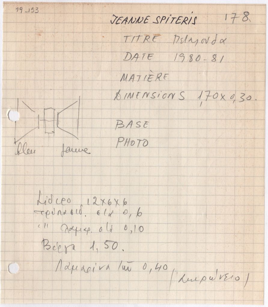 Απόκομμα, χαρτί, μία όψη, 16×14 εκ., επικολλημένο σε φύλλο χαρτιού Α4. Χειρόγραφη φόρμα καταγραφής στοιχείων του έργου στα γαλλικά, όπου συμπληρώνονται χειρόγραφα τα στοιχεία του έργου. Στο χαρτί, σχέδιο του έργου, με μολύβι.
