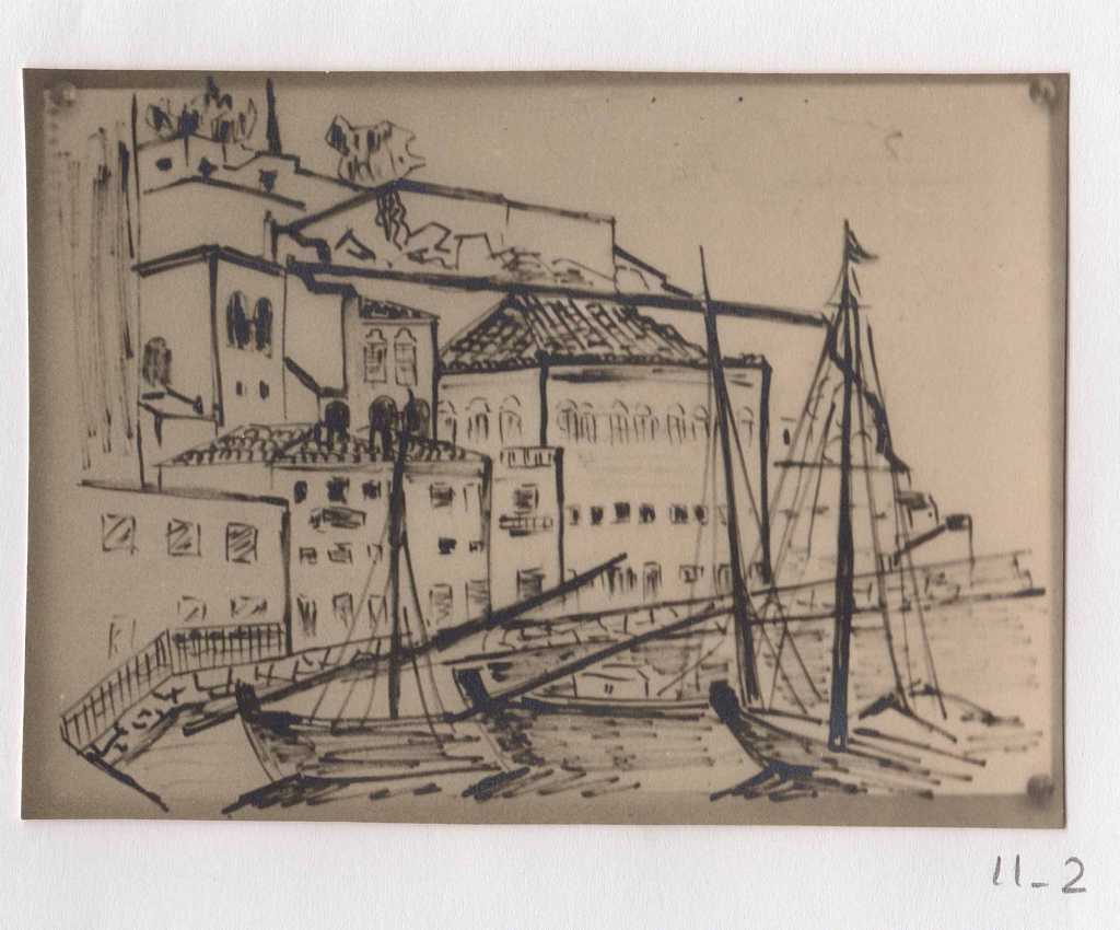 Φωτογραφία, α/μ, φωτογραφικό χαρτί, 7×9,5 εκ., έργου (σχεδίου) της Ιωάννας Βεροπούλου-Σπητέρη, επικολλημένη σε φύλλο Α4 μαζί με άλλες έξι φωτογραφίες, όπου χειρόγραφη σημείωση στα ελληνικά.
