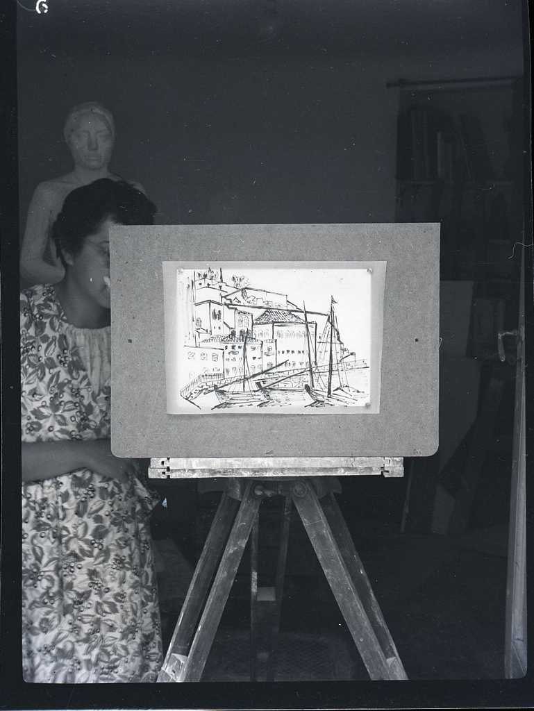 Φιλμ, αρνητικό, α/μ, 6×4,5 εκ., με εικονιζόμενη την Ιωάννα Βεροπούλου-Σπητέρη, πίσω από έργο της. Τοποθετημένο σε διάφανη θήκη αρνητικών, στην οποία υπάρχει επιγραφή (επάνω).