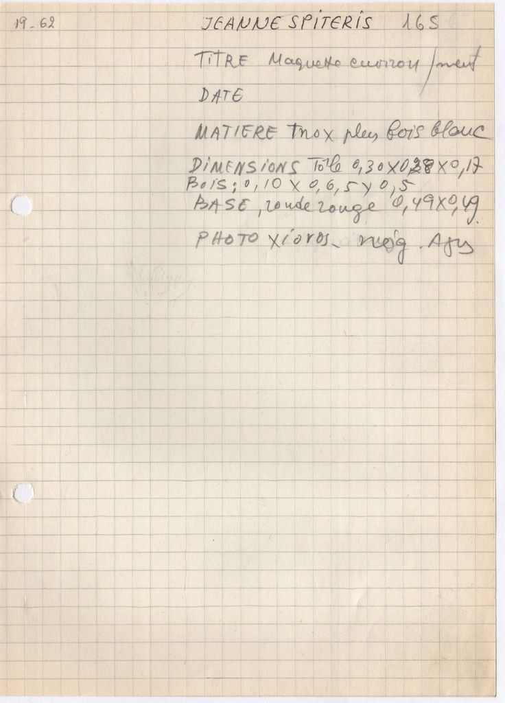 Απόκομμα, χαρτί, μία όψη, 19,5×14 εκ., επικολλημένο σε φύλλο χαρτιού Α4. Χειρόγραφη φόρμα καταγραφής στοιχείων του έργου στα γαλλικά, όπου συμπληρώνονται χειρόγραφα τα στοιχεία του έργου.
