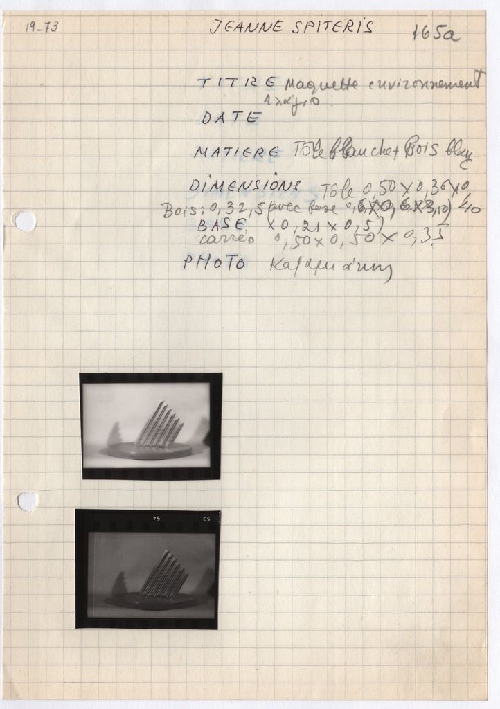 Απόκομμα, χαρτί, μία όψη, 20×14 εκ., επικολλημένο σε φύλλο χαρτιού Α4. Χειρόγραφη φόρμα καταγραφής στοιχείων του έργου στα γαλλικά, όπου συμπληρώνονται χειρόγραφα τα στοιχεία του έργου. Στο χαρτί, επικολλημένες, δύο φωτογραφίες του έργου, α/μ, φωτογραφικό χαρτί, 3×4 εκ. και 3,5×4 εκ.