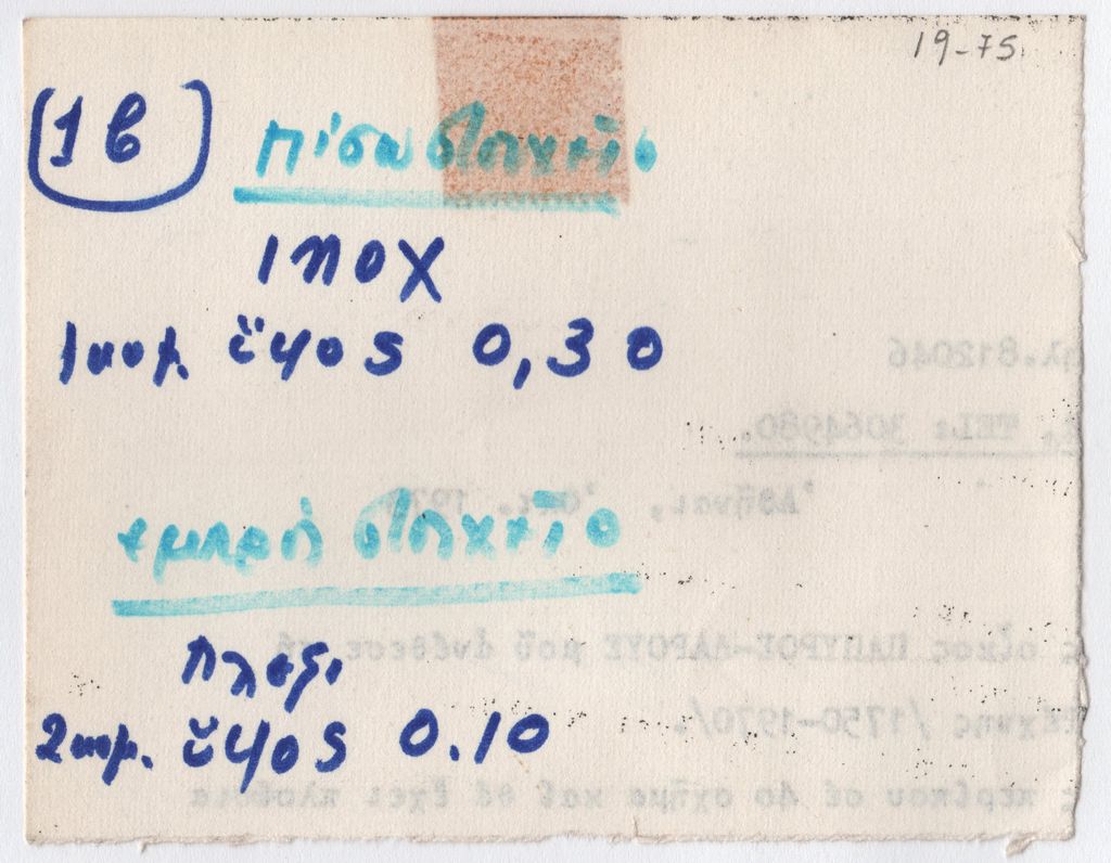 Απόκομμα, χαρτί, 8,5×10,5 εκ., επικολλημένο σε φύλλο χαρτί Α4, όπου επιγραφές, στα ελληνικά. Σημειώσεις, σχετικά με κατασκευαστικά στοιχεία του έργου, “Προτάσεις για διασκευή χώρου”.