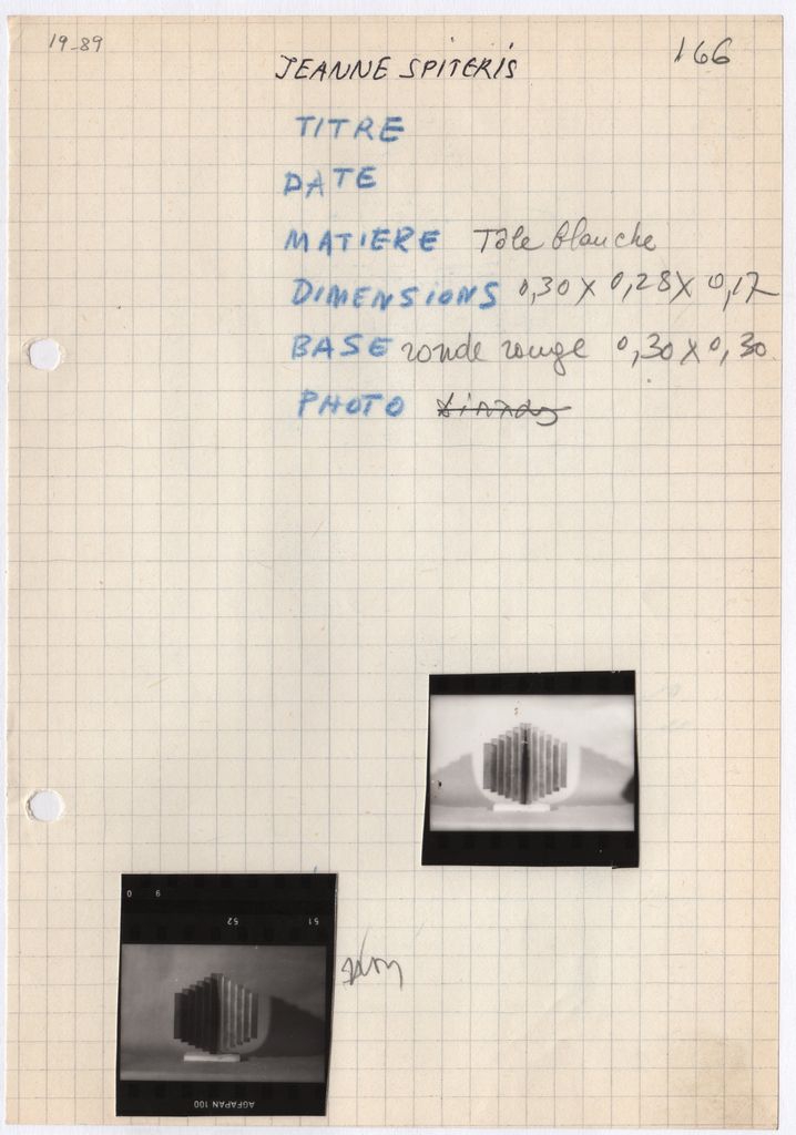 Απόκομμα, χαρτί, μία όψη, 19×14 εκ., επικολλημένο σε φύλλο χαρτιού Α4. Χειρόγραφη φόρμα καταγραφής στοιχείων του έργου στα γαλλικά, όπου συμπληρώνονται χειρόγραφα τα στοιχεία του έργου. Στο χαρτί, επικολλημένες δύο φωτογραφίες του έργου, α/μ, φωτογραφικό χαρτί, 3,5×4 εκ. και 4,5×4 εκ.