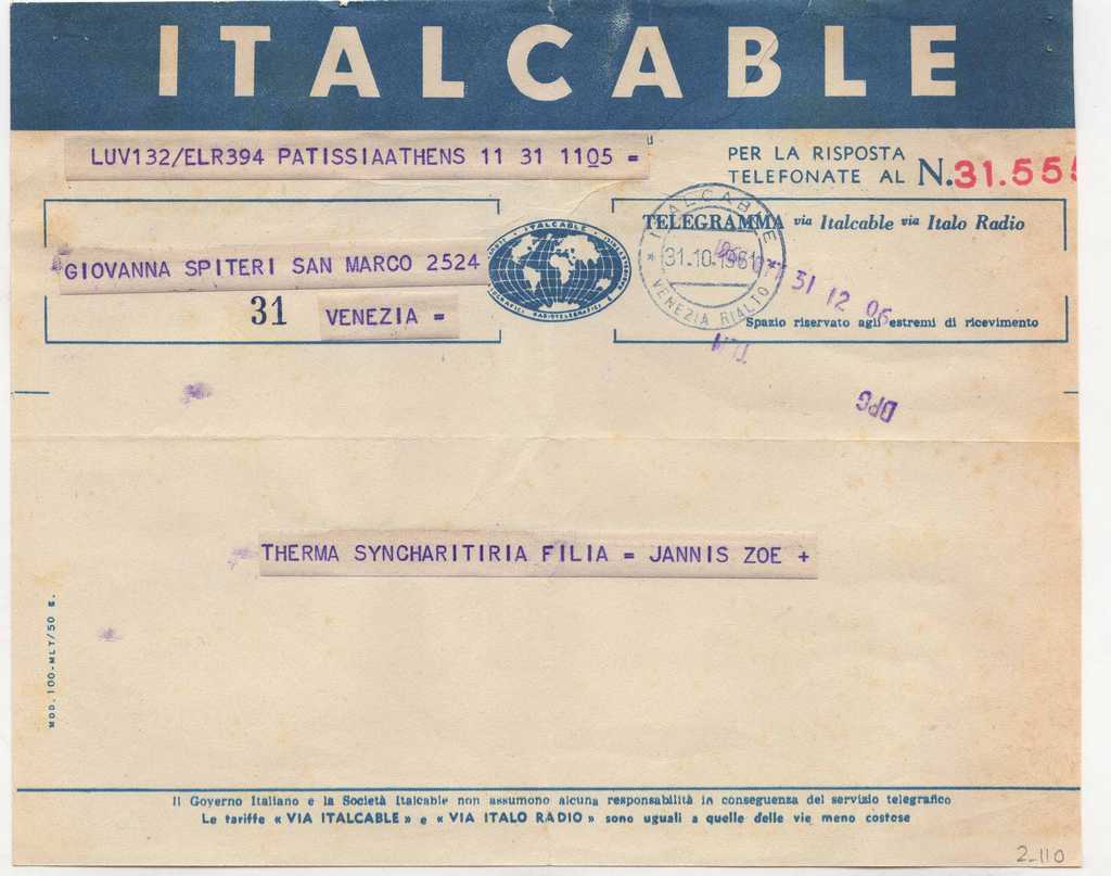 Τηλεγράφημα, έντυπο, στα ιταλικά και στα γαλλικά, χαρτί, 17,5×21,5 εκ. Δίνονται συγχαρητήρια στην Ι.Σπητέρη για την κατάκτηση βραβείου στον διεθνή διαγωνισμό γλυπτικής στην Πάδοβα.