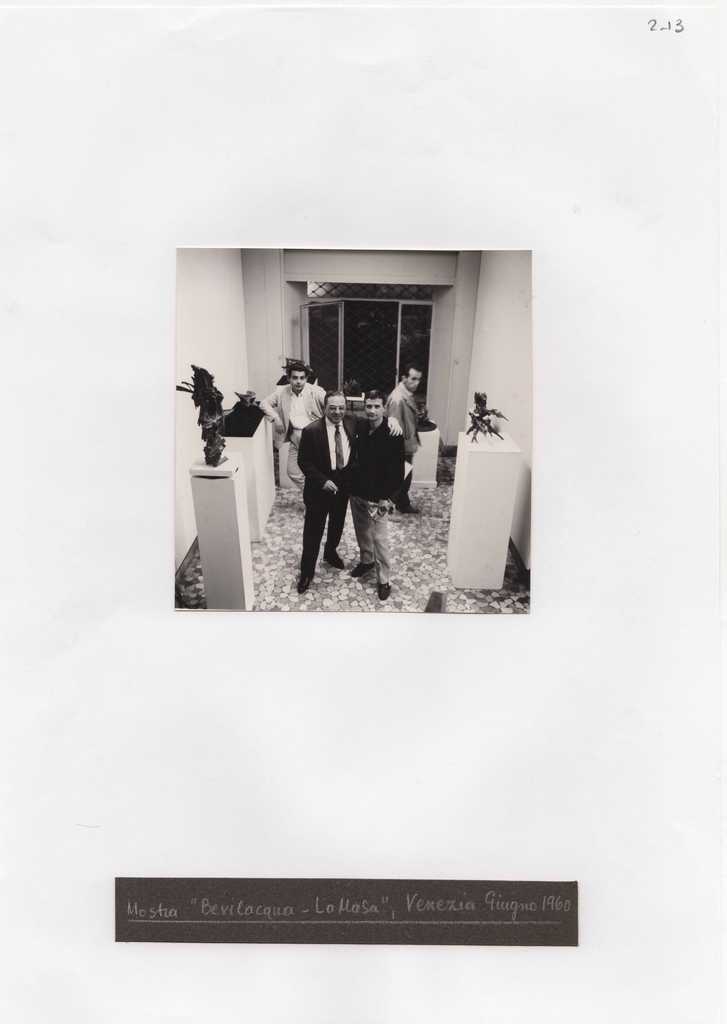 Φωτογραφία, α/μ, φωτογραφικό χαρτί, 10,5×10,5 εκ., επικολλημένη σε φύλλο χαρτί Α4, όπου υπάρχει επικολλημένη λεζάντα, στα ιταλικά με χειρόγραφη σημείωση με λευκή ξυλομπογιά: Mostra “Bevilacqua-La Masa”, Venezia Giugno 1960.