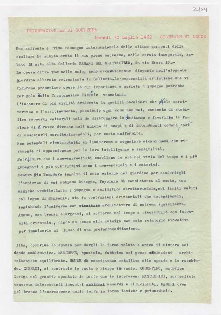 Κείμενο, δακτυλόγραφο, στα ιταλικά, χαρτί, δύο σελίδες, 27×20 εκ. Πρόκειται για αποδελτίωση άρθρου που δημοσιεύθηκε στην εφημερίδα “Giornale di Leccο” (30/07/1962) και αφορά στην έκθεση που έλαβε χώρα στην Galleria Pagani στο Μιλάνο το 1962.