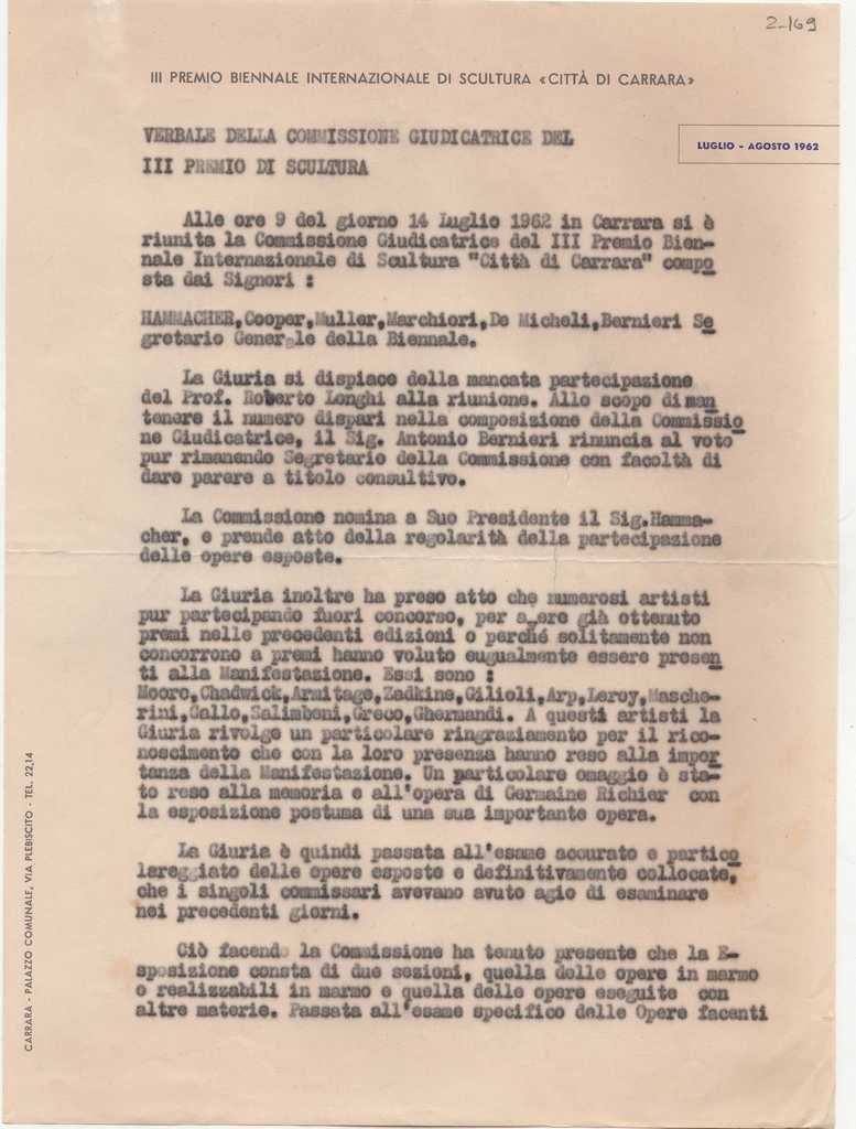 Κείμενο, δακτυλόγραφο, στα ιταλικά, χαρτί, τρεις σελίδες, 28,5×21,5 εκ. Πρόκειται για τα πρακτικά της επιτροπής που συγκλήθηκε για την ανάδειξη των τριών νικητών του διαγωνισμού “III Premio Biennale Internazionale di Scultura-Città di Carrara”.