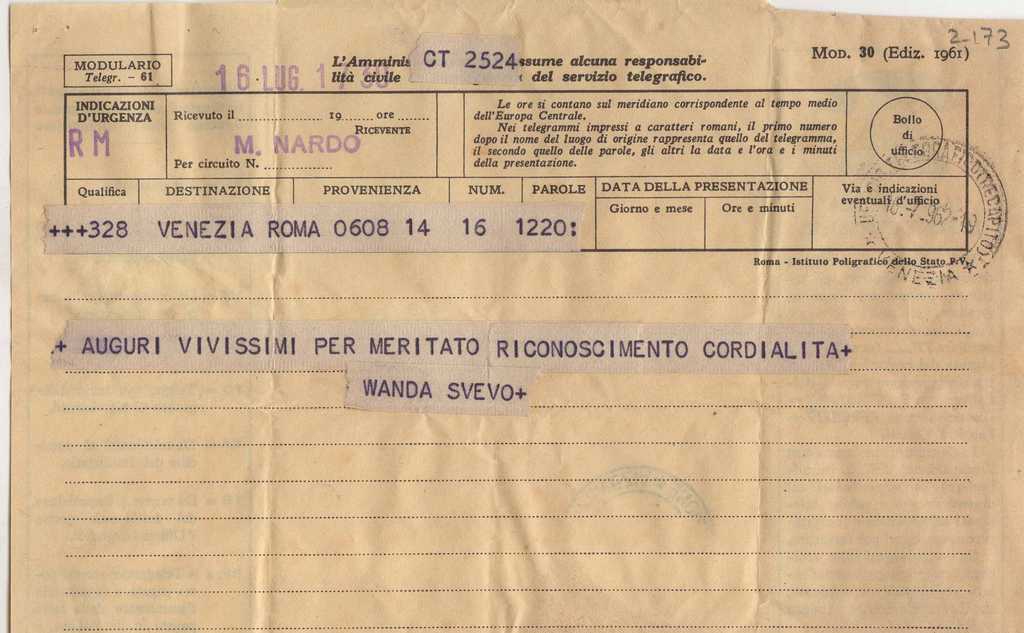 Τηλεγράφημα, έντυπο, στα ιταλικά, χαρτί, δύο όψεις, 15,5×20 εκ. Δίνονται συγχαρητήρια στην Ι.Σπητέρη για την κατάκτηση βραβείου στον διαγωνισμό “III Premio Biennale Internazionale di Scultura-Città di Carrara”.
