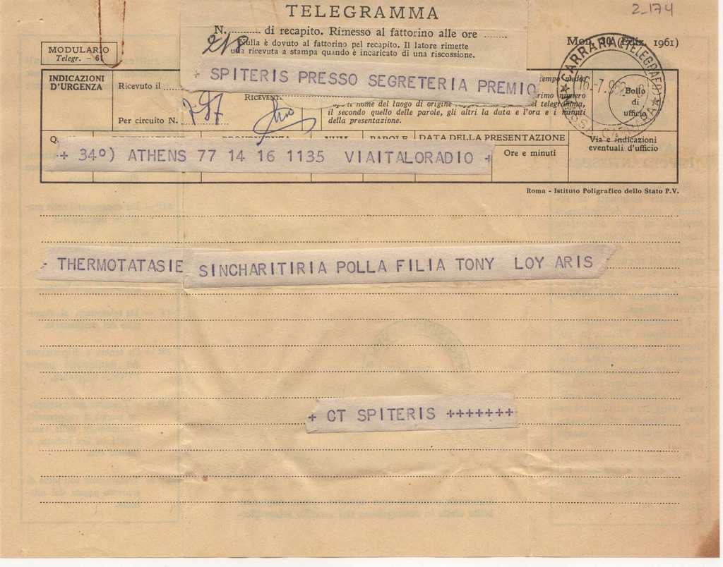 Τηλεγράφημα, έντυπο, στα ελληνικά, χαρτί, δύο όψεις, 15,5×20 εκ. Δίνονται συγχαρητήρια στην Ι.Σπητέρη για την κατάκτηση βραβείου στον διαγωνισμό “III Premio Biennale Internazionale di Scultura-Città di Carrara”.