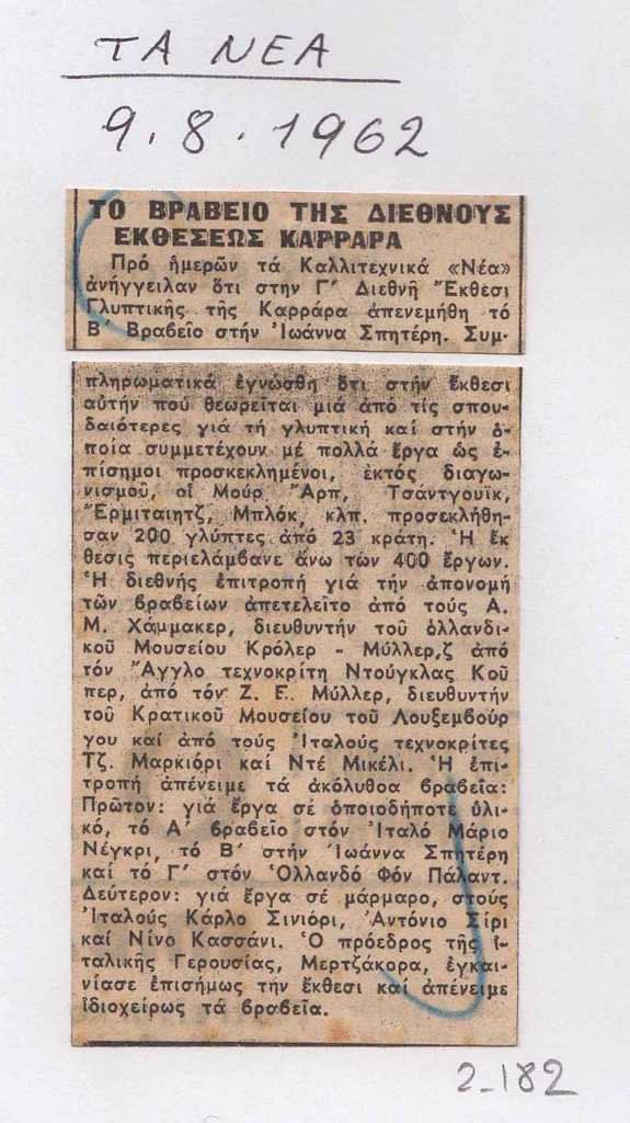 Απόκομμα, έντυπο, στα ελληνικά, χαρτί, 9×5 εκ, επικολλημένο σε φύλλο χαρτί Α4. Αναφορά στον διαγωνισμό “III Premio Biennale Internazionale di Scultura-Città di Carrara” και στην κατάκτηση του 2ου βραβείου από την Ι.Σπητέρη, Στο χαρτί, επιγραφή, στα ελληνικά.