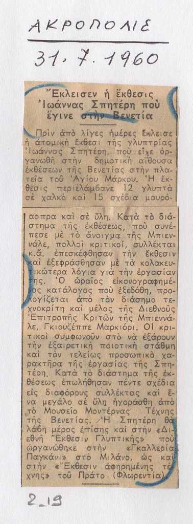 Έντυπο, στα ελληνικά, χαρτί, 11,5×4,5 εκ., επικολλημένο σε φύλλο χαρτί Α4, όπου επιγραφή στα ελληνικά. Αναφορά στην έκθεση της Ι. Βεροπούλου-Σπητέρη, που πραγματοποιήθηκε τον Ιούνιο του 1960 στην Βενετία, στην ολοκλήρωσή της και στις επόμενες εκθέσεις που θα λάβει μέρος η γλύπτρια.
