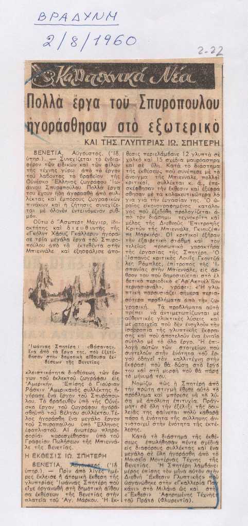 Έντυπο, στα ελληνικά, χαρτί, 20×9 εκ., επικολλημένο σε φύλλο χαρτί Α4, όπου επιγραφή, στα ελληνικά. Αναφορά στην αγορά έργων ελλήνων καλλιτεχνών και συγκεκριμένα της Ι. Σπητέρη από το μουσείο της Βενετίας.