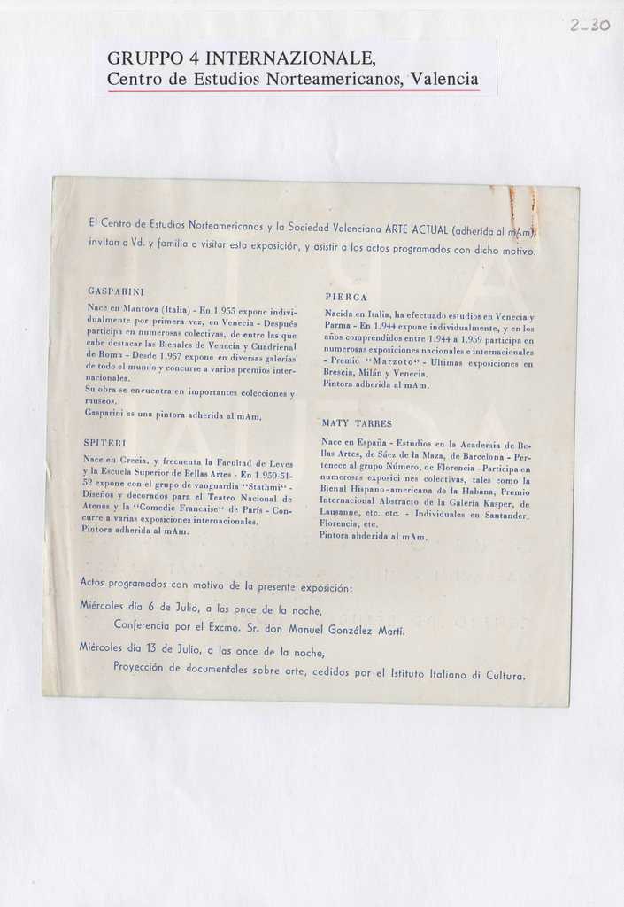 Έντυπο, στα ισπανικά, μονόφυλλο,χαρτόνι, δύο όψη, 17×17 εκ., επικολλημένο σε φύλλο χαρτί Α4. Έντυπο ομαδικής έκθεσης που συμμετέχει η Ι. Βεροπούλου-Σπητέρη, το καλοκαίρι του 1960 στην Βαλένθια. Αναφορά σε βιογραφικά στοιχεία των καλλιτέχνιδων. Στο χαρτί επικολλημένη, έντυπη λεζάντα, στα ισπανικά: Gruppo 4 Internazionale, Centro de Estudios Norteamericanos, Valencia.