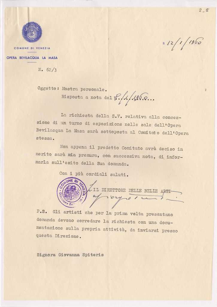 Κείμενο, δακτυλόγραφο, στα ιταλικά, 28×20 εκ., επικολλημένο σε φύλλο χαρτί Α4. Προώθηση του αιτήματος της Ι. Σπητέρη στην για την διεξαγωγή της έκθεση της στη γκαλερί Bevilacqua La Masa, στην αρμόδια επιτροπή.