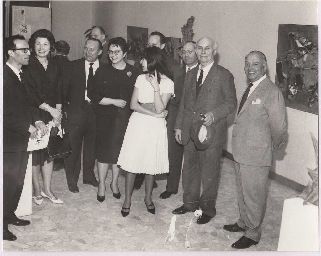 Φωτογραφία, α/μ, φωτογραφικό χαρτί, 12,5×15 εκ., επικολλημένη σε φύλλο χαρτί Α4, μαζί με άλλη φωτογραφία, όπου επιγραφή και επικολλημένη χειρόγραφη λεζάντα, με μολύβι, στα ελληνικά: 1961-Μιλάνο, Έκθεση Ι.Σπητέρη-Γ.Σπυρόπουλου.