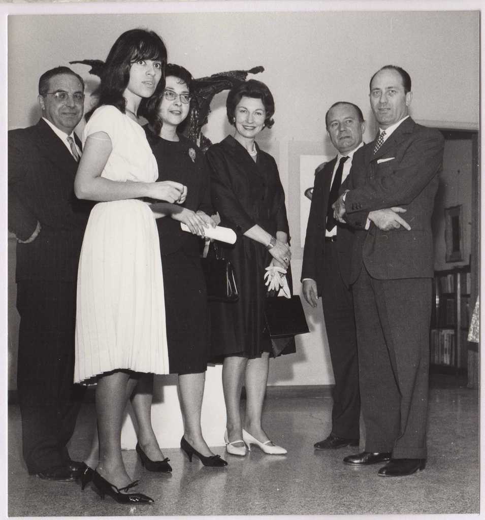 Φωτογραφία, α/μ, φωτογραφικό χαρτί, 14×13 εκ., επικολλημένη σε φύλλο χαρτί Α4, μαζί με άλλη φωτογραφία, όπου επιγραφή και επικολλημένη χειρόγραφη λεζάντα, με μολύβι, στα ελληνικά: 1961-Μιλάνο, Έκθεση Ι.Σπητέρη-Γ.Σπυρόπουλου.