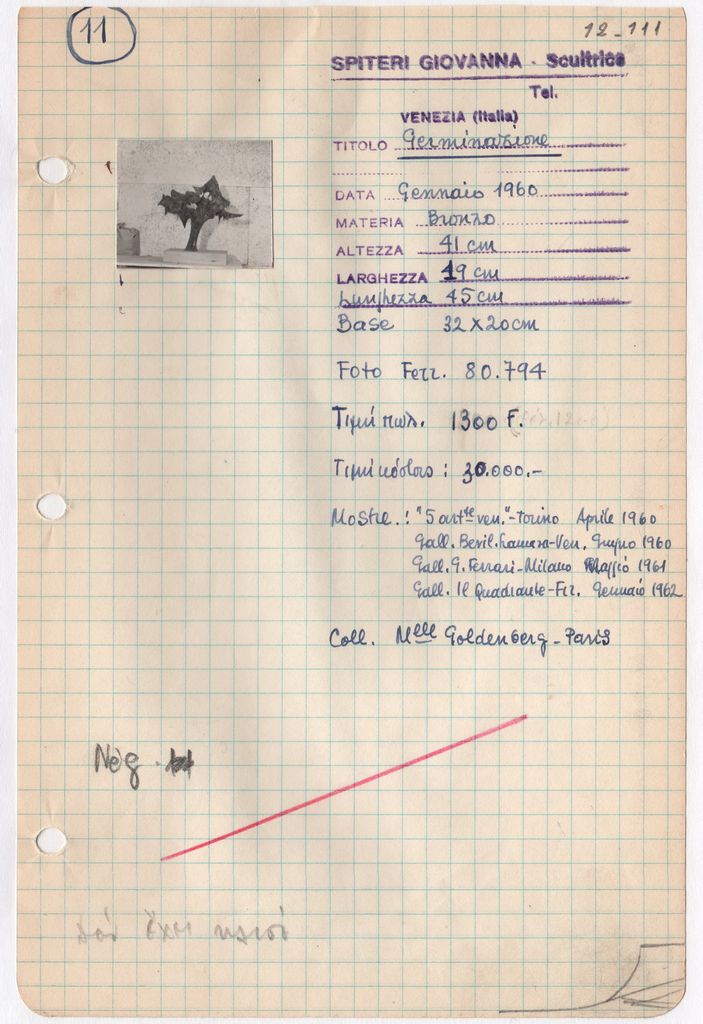 Απόκομμα, χαρτί, μία όψη, 21×14 εκ., επικολλημένο σε φύλλο χαρτιού Α4. Φόρμα καταγραφής στοιχείων έργου, όπου είναι επικολλημένη φωτογραφία του έργου, α/μ, φωτογραφικό χαρτί, 2,5×3,5 εκ. και σφραγίδα, στα ιταλικά, όπου συμπληρώνονται χειρόγραφα τα στοιχεία του έργου, στα ιταλικά.