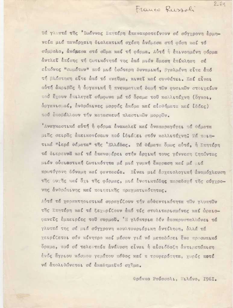 Κείμενο, δακτυλόγραφο, στα ελληνικά, χαρτί, 29×21,5 εκ. Δακτυλόγραφη μετάφραση στα ελληνικά, κειμένου του Franco Russoli για την γλυπτική της Ιωάννας Βεροπούλου-Σπητέρη. Στο χαρτί, επιγραφή στα ιταλικά.
