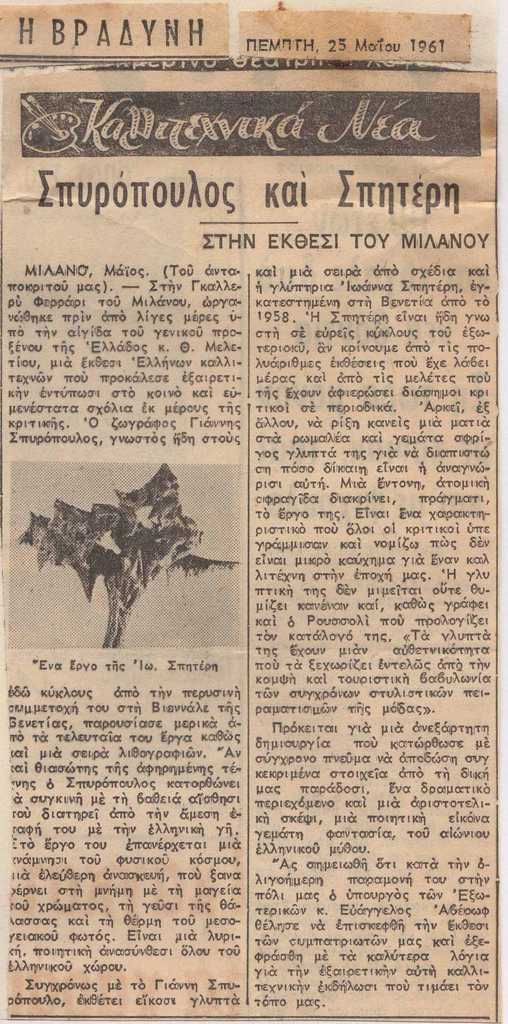 Απόκομμα, έντυπο, στα ελληνικά, χαρτί, 18×9 εκ., επικολλημένο σε φύλλο χαρτί Α4, μαζί με άλλα αποκόμματα. Αναφέρεται στα εγκαίνια της ομαδική έκθεση των Γ. Σπυρόπουλου και Ι. Βεροπούλου-Σπητέρη στην Galleria Gian Ferrari στο Μιλάνο την άνοιξη του 1961. Εικονογράφηση αναπαραγωγή έργου.