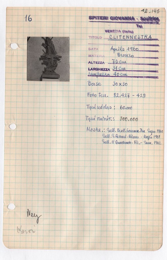 Απόκομμα, χαρτί, μία όψη, 21×14 εκ., επικολλημένο σε φύλλο χαρτιού Α4. Φόρμα καταγραφής στοιχείων έργου, όπου είναι επικολλημένη φωτογραφία του έργου, α/μ, φωτογραφικό χαρτί, 4×3,5 εκ. και σφραγίδα, στα ιταλικά, όπου συμπληρώνονται χειρόγραφα τα στοιχεία του έργου, στα ιταλικά.