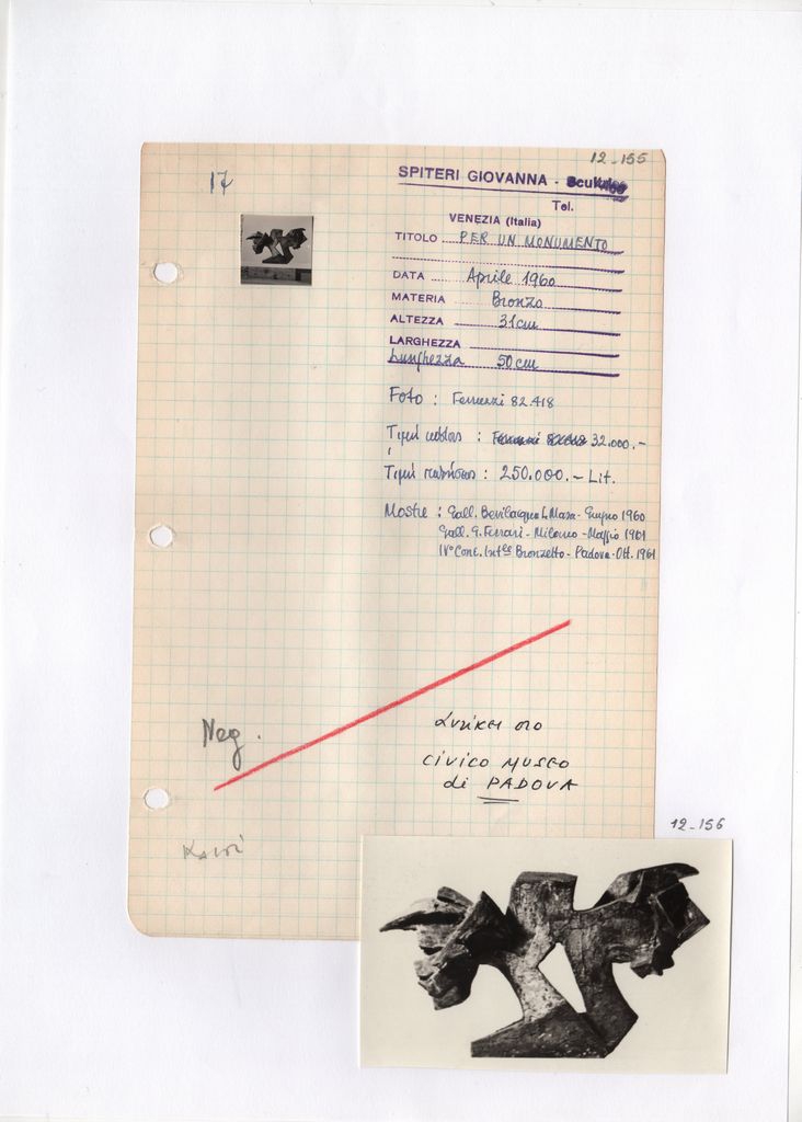 Απόκομμα, χαρτί, μία όψη, 21×14 εκ., επικολλημένο σε φύλλο χαρτιού Α4. Φόρμα καταγραφής στοιχείων έργου, όπου είναι επικολλημένη φωτογραφία του έργου, α/μ, φωτογραφικό χαρτί, 2×2 εκ. και σφραγίδα, στα ιταλικά, όπου συμπληρώνονται χειρόγραφα τα στοιχεία του έργου, στα ιταλικά. Κάτω δεξιά επικολλημένη φωτογραφία με αναπαραγωγή του έργου, όμοια με την φωτογραφία του δελτίου, α/μ, 6×9,5 εκ.
