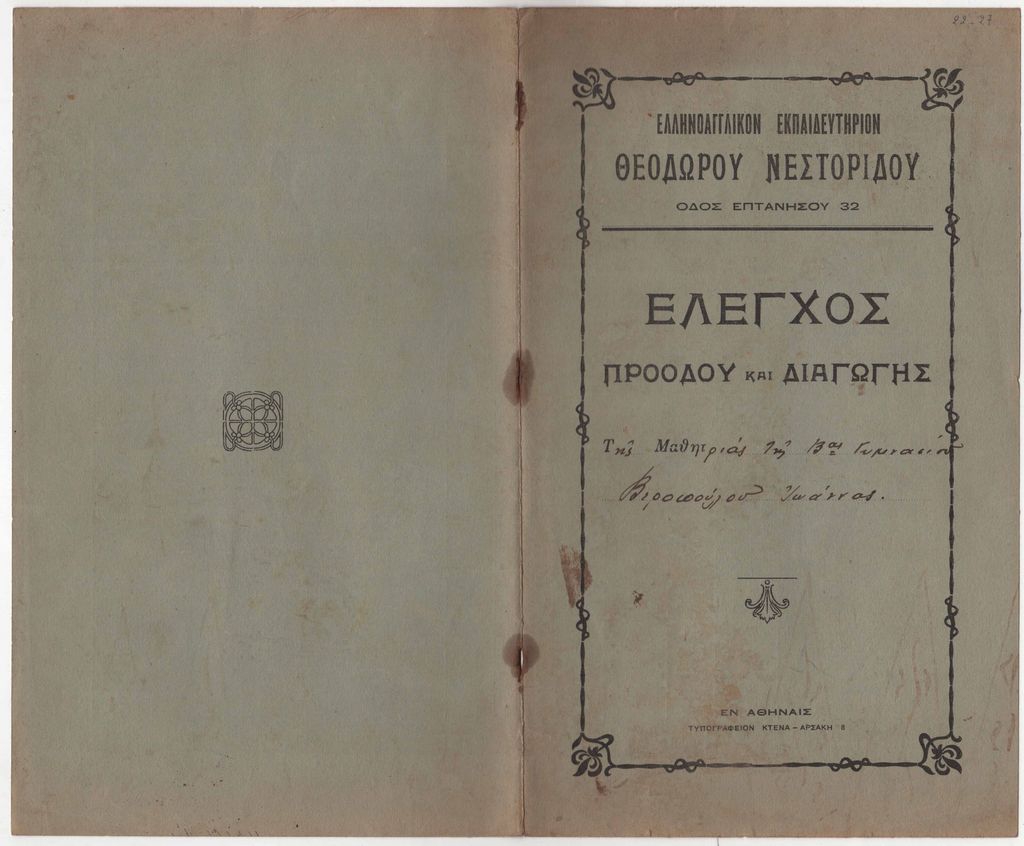 Έλεγχος προόδου και Διαγωγής της Ιωάννας Βεροπούλου Σπητέρη από το Ελληνοαγγλικόν Εκπαιδευτήριον Θεόδωρου Νεστορίδου, Αθήνα, όπου φοίτησε η Ιωάννα Βεροπούλου στην Β’ τάξη του Γυμνασίου. Εκδόθηκε στις 16/12/1933. Φέρει υπογραφή της Δέσποινας Βεροπούλου, μητέρας της Ιωάννας.