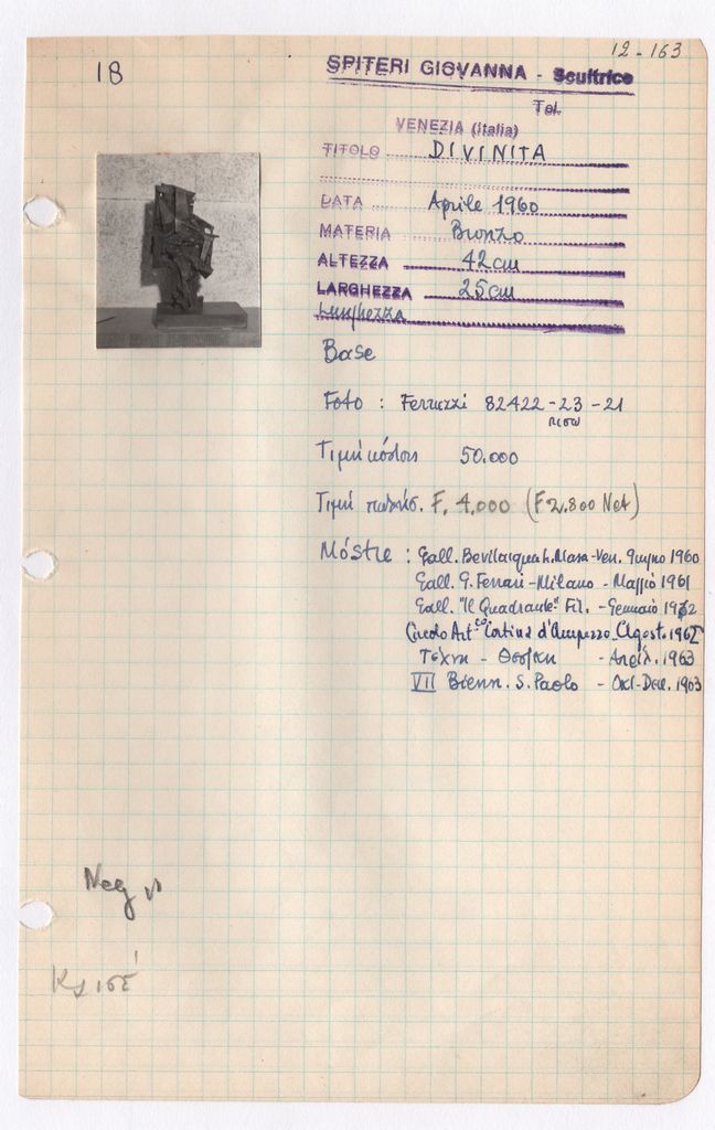 Απόκομμα, χαρτί, μία όψη, 21×14 εκ., επικολλημένο σε φύλλο χαρτιού Α4. Φόρμα καταγραφής στοιχείων έργου, όπου είναι επικολλημένη φωτογραφία του έργου, α/μ, φωτογραφικό χαρτί, 4×3 εκ. και σφραγίδα, στα ιταλικά, όπου συμπληρώνονται χειρόγραφα τα στοιχεία του έργου, στα ιταλικά.