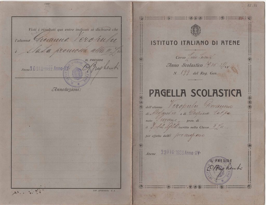 Έλεγχος προόδου της Ιωάννας Βεροπούλου από το Instituto Italiano di Atene όπου φοίτησε κατά το έτος 1936-37. Έντυπο, δίπτυχο, στα ιταλικά με χειρόγραφες συμπληρώσεις στα ιταλικά, με μαύρο μελάνι. Φέρει την υπογραφή του πατέρα της Ιωάννας, Αλέξανδρου Βερόπουλου.