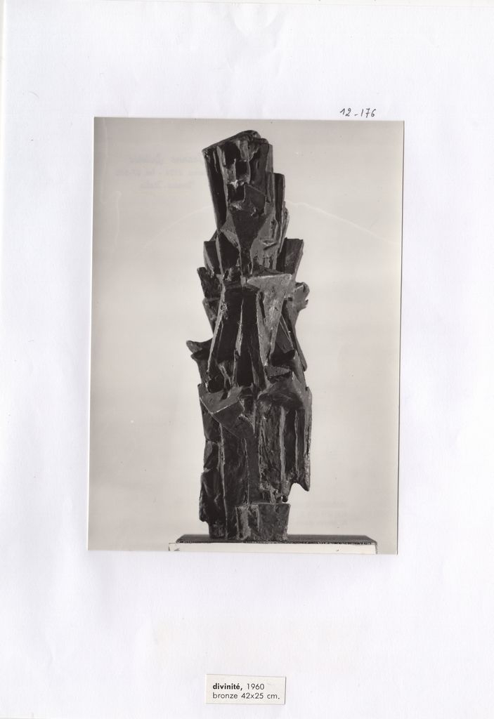 Φωτογραφία, α/μ, φωτογραφικό χαρτί, 18×13 εκ. Στην πίσω όψη, σφραγίδα της καλλιτέχνιδας, στα γαλλικά και σφραγίδα του φωτογράφου Ferruzzi, στα ιταλικά. Κάτω από τη φωτογραφία, επικολλημένο απόκομμα χαρτιού με έντυπη λεζάντα, στα γαλλικά: divinité, 1960, bronze 42×25 cm.