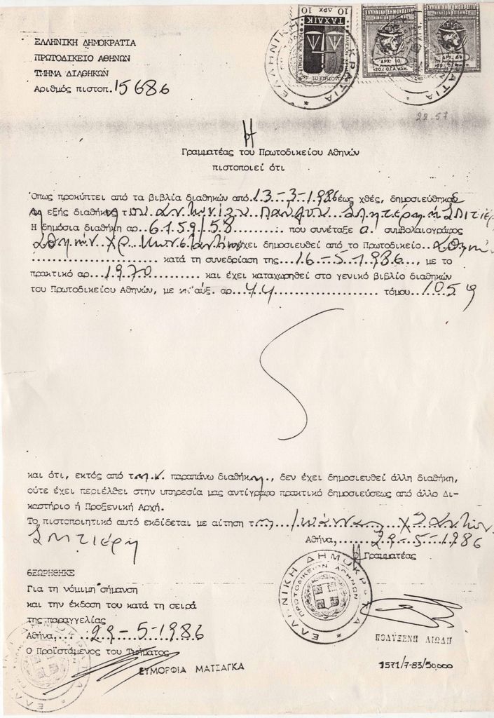 Πιστοποιητικό δημοσίευσης διαθήκης του Τώνη Σπητέρη, που εκδόθηκε από το Πρωτοδικείο Αθηνών, Τμήμα Διαθηκών στις 29/05/1986. Κείμενο, δακτυλόγραφο, στα ελληνικά, χαρτί.