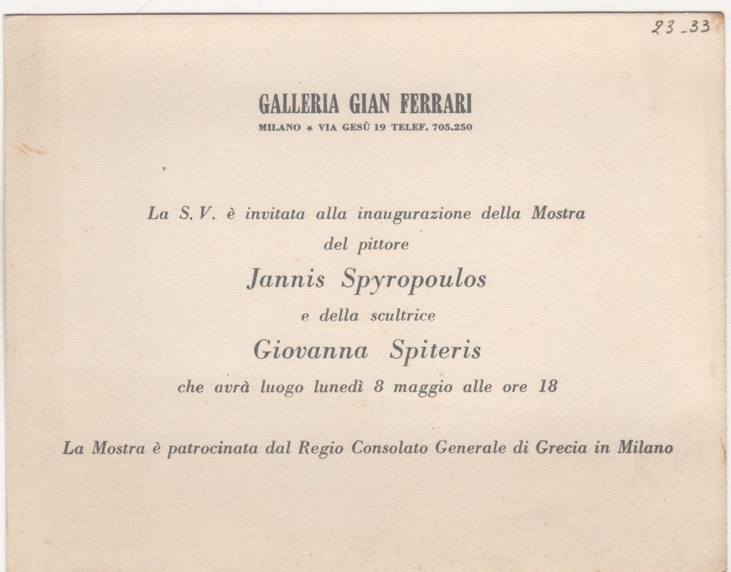 Πρόσκληση εγκαινίων έκθεσης του Γιάννη Σπυρόπουλου και της Ιωάννας Σπητέρη, Galleria Gian Ferrari, Milano, 08/05/19.. Όμοιο το _33a.