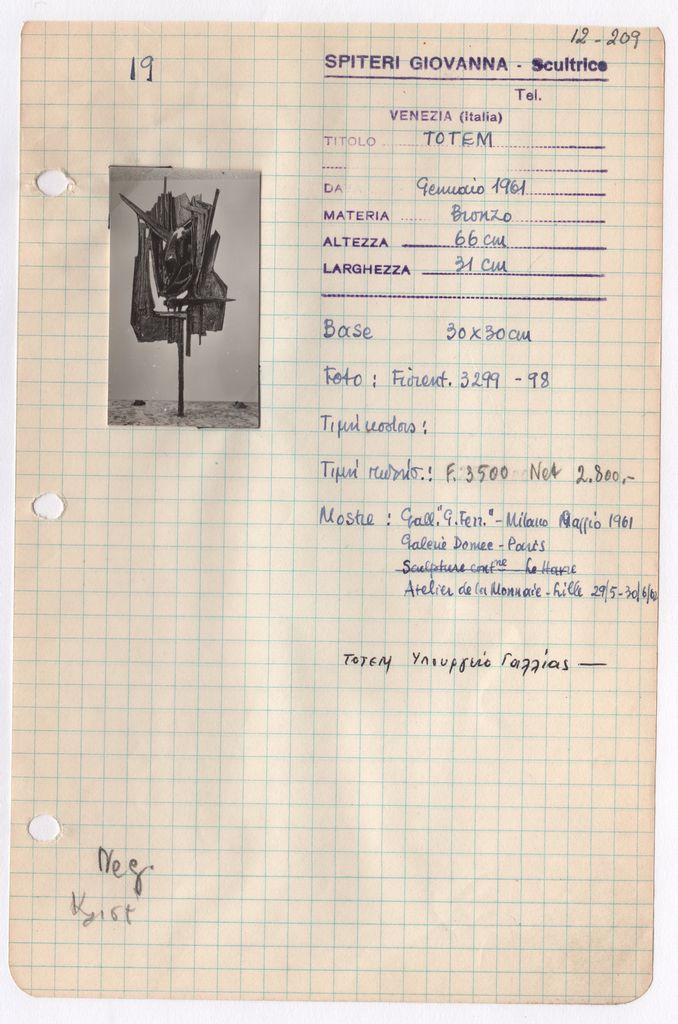 Απόκομμα, χαρτί, μία όψη, 21×14 εκ., επικολλημένο σε φύλλο χαρτιού Α4. Φόρμα καταγραφής στοιχείων έργου, όπου είναι επικολλημένη φωτογραφία του έργου, α/μ, φωτογραφικό χαρτί, 5,5×3 εκ. και σφραγίδα, στα ιταλικά, όπου συμπληρώνονται χειρόγραφα τα στοιχεία του έργου, στα ιταλικά.