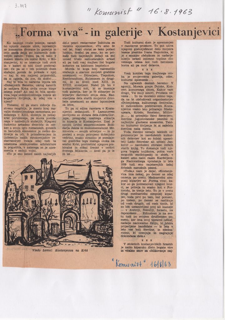 Απόκομμα εντύπου, στα σερβοκροάτικα, χαρτί, δύο τμήματα, 23×20 εκ. και 20,5×6 εκ., επικολλημένα σε φύλλο χαρτί Α4. Αναφορά στην διεξαγωγή του Forma Viva – III Symposium International des Sculpteurs στο οποίο συμμετείχε και η Ι.Σπητέρη. Στο αόκομμα και στο χαρτί, επιγραφές.