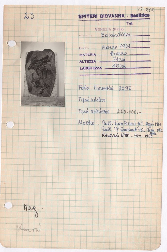 Απόκομμα, χαρτί, μία όψη, 21×14 εκ., επικολλημένο σε φύλλο χαρτιού Α4. Φόρμα καταγραφής στοιχείων έργου, όπου είναι επικολλημένη φωτογραφία του έργου, α/μ, φωτογραφικό χαρτί, 5,5×4 εκ. και σφραγίδα, στα ιταλικά, όπου συμπληρώνονται χειρόγραφα τα στοιχεία του έργου, στα ιταλικά.