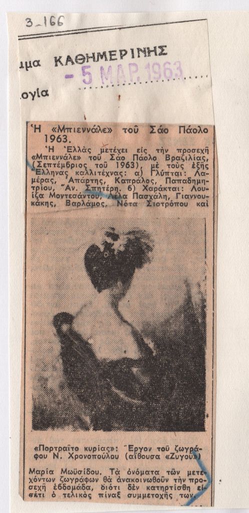 Απόκομμα εντύπου, στα ελληνικά, χαρτί, 15×10 εκ., επικολλήμενο σε φύλλο χαρτί Α4. Αναφορά στην έκθεση “VII Bienal de São Paulo” και στην συμμετοχή ελληνών καλλιτεχνών.