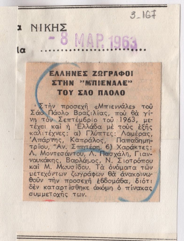 Απόκομμα εντύπου, στα ελληνικά, χαρτί, 5×5 εκ., επικολλήμενο σε φύλλο χαρτί Α4. Αναφορά στην έκθεση “VII Bienal de São Paulo” και στην συμμετοχή ελληνών καλλιτεχνών.