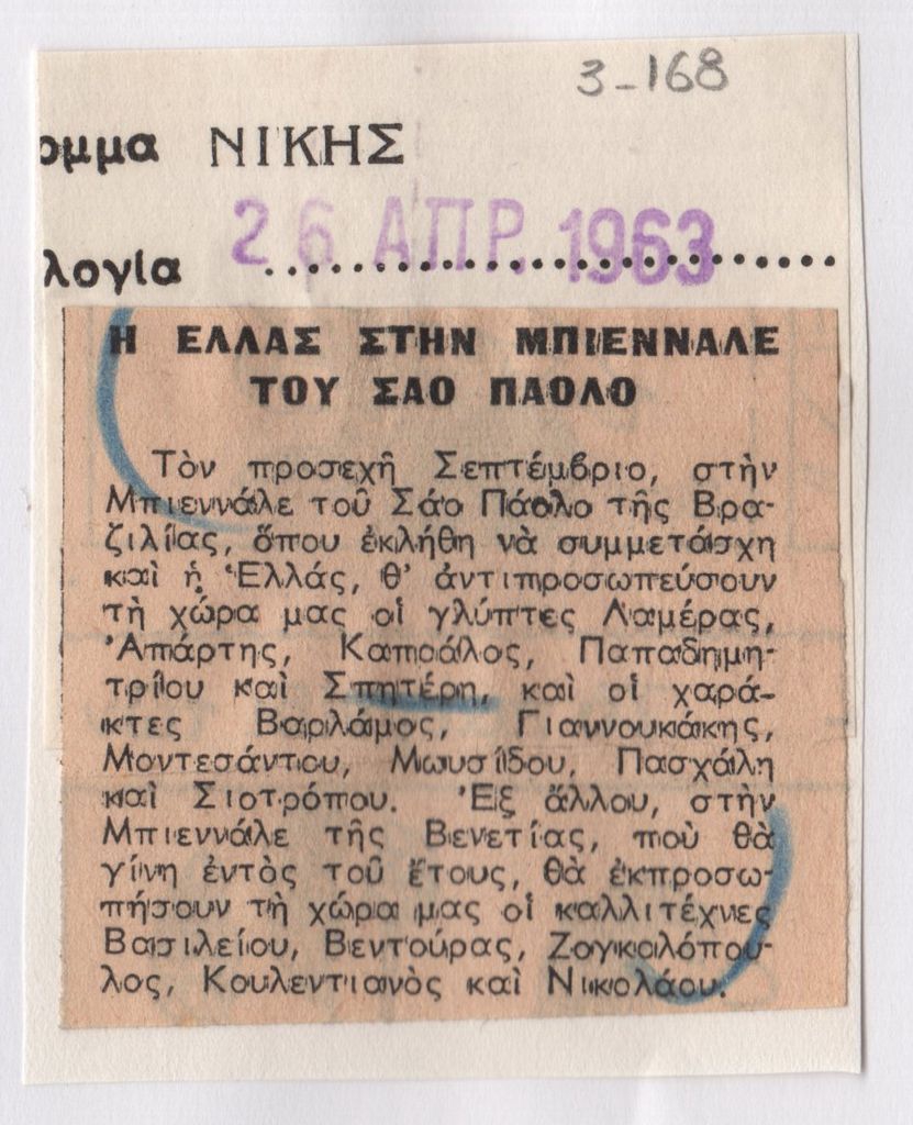 Απόκομμα εντύπου, στα ελληνικά, χαρτί, 5×5 εκ., επικολλήμενο σε φύλλο χαρτί Α4. Αναφορά στην έκθεση “VII Bienal de São Paulo” και στην συμμετοχή ελληνών καλλιτεχνών.