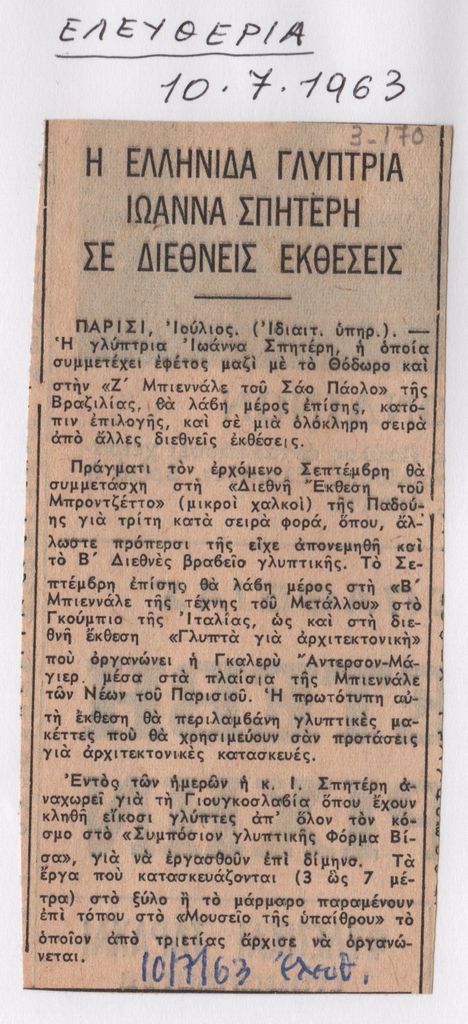 Απόκομμα εντύπου, στα ελληνικά, χαρτί, 11×5 εκ., επικολλημένο σε φύλλο χαρτί Α4. Αναφορά στις διεθνείς εκθέσεις που έλαβε μέρος η Ι.Βεροπούλου-Σπητέρη. Στο απόκομμα επιγραφή στα ελληνικά.