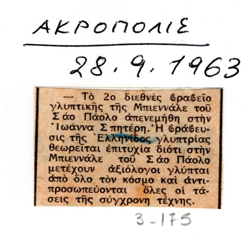 Απόκομμα εντύπου, στα ελληνικά, χαρτί, 2,5×4 εκ., επικολλημένο σε φύλλο χαρτί, όπου επιγραφή, στα ελληνικά. Αναφορά στην βράβευση της Ι.Βεροπούλου-Σπητέρη στην έκεθση “VII Bienal de São Paulo”. Στο χαρτί, επιγραφή, στα ελληνικά.