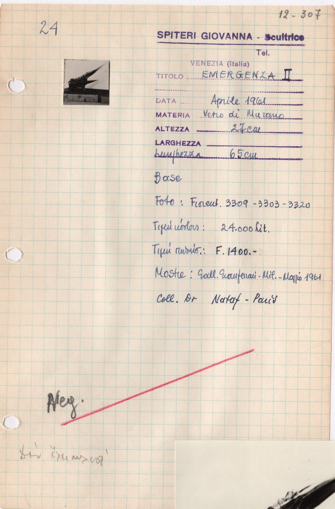 Απόκομμα, χαρτί, μία όψη, 21×14 εκ., επικολλημένο σε φύλλο χαρτιού Α4. Φόρμα καταγραφής στοιχείων έργου, όπου είναι επικολλημένη φωτογραφία του έργου, α/μ, φωτογραφικό χαρτί, 2×2 εκ. και σφραγίδα, στα ιταλικά, όπου συμπληρώνονται χειρόγραφα τα στοιχεία του έργου, στα ιταλικά. Κάτω δεξιά επικολλημένη φωτογραφία με αναπαραγωγή του έργου, όμοια με την φωτογραφία του δελτίου, α/μ, 7×9 εκ.