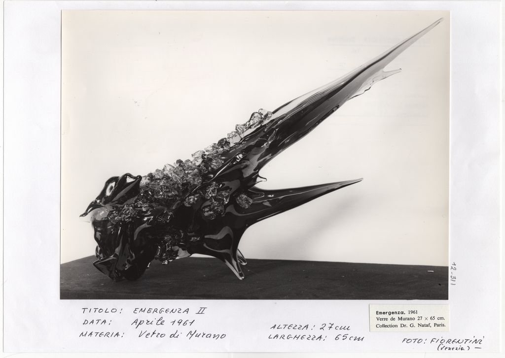 Φωτογραφία, α/μ, φωτογραφικό χαρτί, 17,5×23 εκ. Στην πίσω όψη, σφραγίδα-φόρμα της καλλιτέχνιδας συμπληρωμένη με πληροφορίες για το έργο, στα ιταλικά και σφραγίδα του φωτογράφου Fiorentini, στα ιταλικά. Κάτω από τη φωτογραφία, επικολλημένο απόκομμα χαρτιού με έντυπη λεζάντα, στα γαλλικά: Emergenza, 1961. Verre de Murano 27×65 cm. Collection Dr. G. Nataf, Paris. Επικολλημένη σε φύλλο Α4, όπου επιγραφές στα ιταλικά.