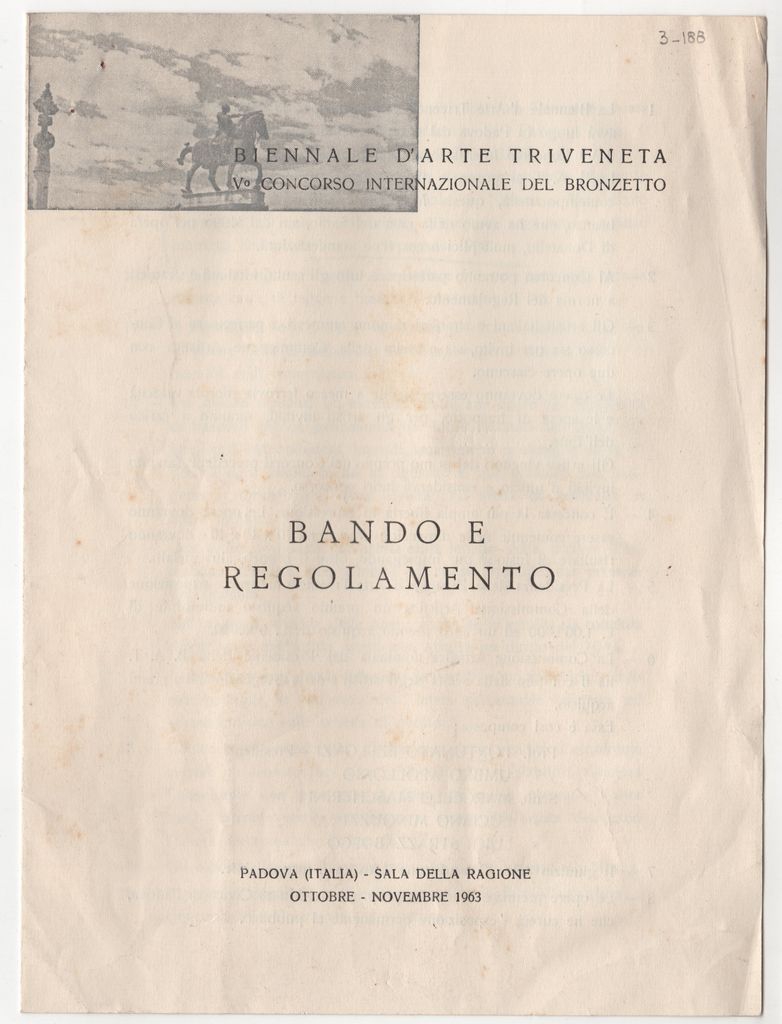 Έντυπο έκθεσης, στα ιταλικά, χαρτί, δίπτυχο, 23×17 εκ. Αναφορά στους κανονισμούς συμμετοχής στην έκθεση “XV Biennale d’Arte Triveneta – Vo Concorso Internazionale del Bronzeto”.