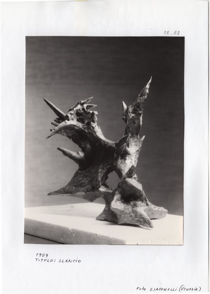 Φωτογραφία, α/μ, 21×16 εκ. Στην πίσω όψη, σφραγίδα-φόρμα της καλλιτέχνιδας συμπληρωμένη με πληροφορίες για το έργο, στα ιταλικά και σφραγίδα του φωτογράφου Giacomelli, στα ιταλικά. Επικολλημένη σε φύλλο Α4, όπου επιγραφή στα ιταλικά.