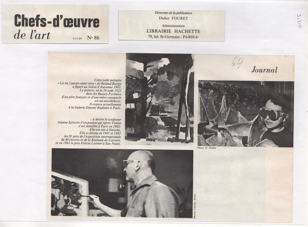 Απόκομμα εντύπου, στα γαλλικά, χαρτί ιλουστρασιόν, δύο τμήματα: 15,5×23,5 εκ. και 12,5×23,5 εκ., επικολλημένα σε φύλλο χαρτί Α4. Αναφορά στην γύπτρια Ι.Σπητέρη και στην καλλιτεχνική της δημιουργία.