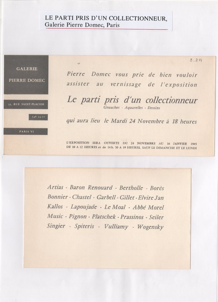 Έντυπο, στα γαλλικά, χαρτόνι, δύο τμήματα: 10×20,5 και 10×16 εκ., επικολλημένα σε φύλλο χαρτί Α4. Σύντομος κατάλογος καλλιτεχνών, μεταξύ των οποίων κσι η Ι.Σπητέρη. Στο χαρτί, επικολλημένη έντυπη λεζάντα στα γαλλικά: Le parti d’un collectonneur, Galerie Pierre Domec, Paris.