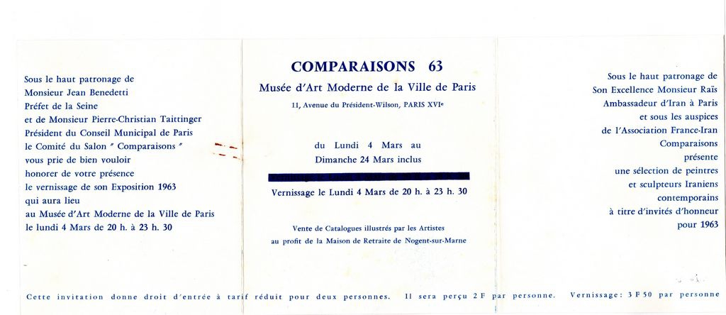 Έντυπο, στα γαλλικά, χαρτόνι, τρίπτυχο, μία όψη, 11,5×10,5 εκ., επικολλημένο σε φύλλο χαρτί Α4. Πρόσκληση για την έκθεση Comparaisons 63 που πραγματοποιήθηκε στο Παρίσι, τον Μάρτιο του 1963.