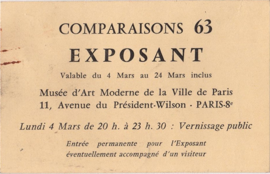 Έντυπο, στα γαλλικά, χαρτόνι, μία όψη, 7×10,5 εκ. Κάρτα εισόδου συμμετέχοντα καλλιτέχνη στην έκθεση “Comparaisons 63”.